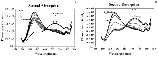 Fluorescence spectra of the nanocrystals of [Pt(tpy)Cl](PF6) (by time) during the first (A) absorption and (B) desorption of MeCN vapor (λex = 436 nm).