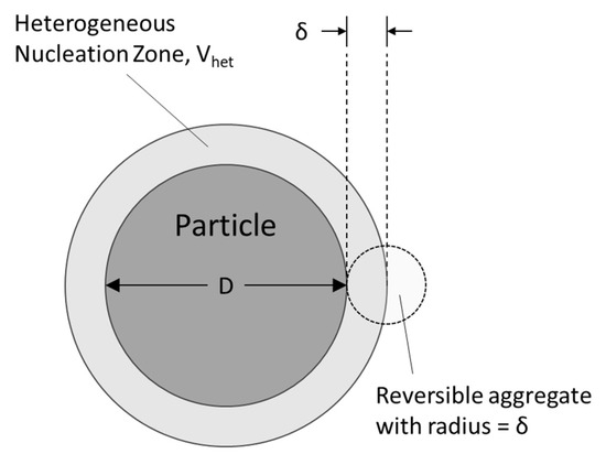For assessing condition (i), we must consider the solution volume with a thickness equal to the radius of a reversibly aggregated region around the particle. Outside this zone, reversible aggregates will not be intersected by the particle surface. Assuming the particle has a spherical shape with a diameter d, the situation sketched in Figure 1 applies. The volume of the potential heterogeneous nucleation zone is given by the thickness δ of the relevant interfacial solution region as