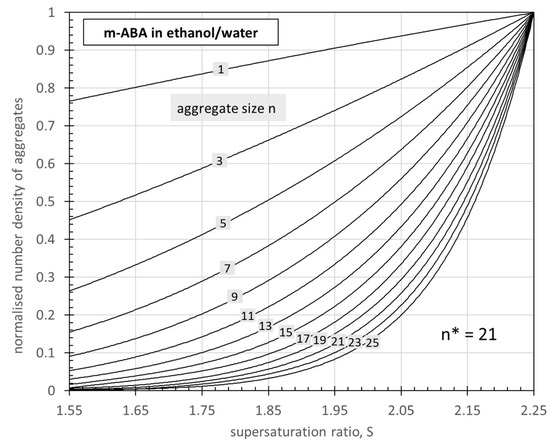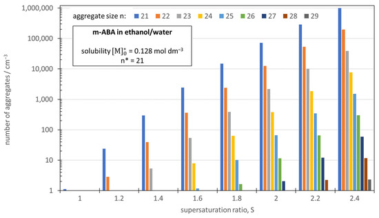 To illustrate the concept of nucleation from the largest excess reversible aggregates further, the supersaturation-dependent size distribution of the largest aggregates of m-ABA is shown in Figure 3. The near-exponential increase in the reversible m-ABA aggregate count with sizes n ≥ n* in 1 cm3 solution is evident (note the logarithmic scale of the y-axis). At the solubility concentration (S = 1), the solution contains a single aggregate with n = 21, in line with the predicted n* = 21 from Equation (12), and no aggregates with n > 21. The effect of increasing supersaturation is a near-exponential rise in the population of aggregates with larger sizes. For example, at S = 2.4, the aggregate size distribution extends to n = 29.