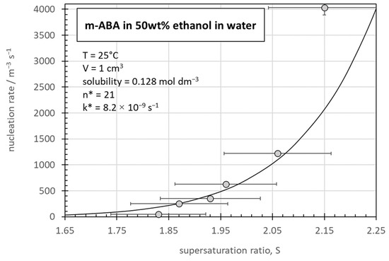 The fitting analysis of the rate predicted by Equation (15) against experimental J data for the m-ABA/ethanol/water system [21] is illustrated in Figure 4. Least-squares fitting of Equation (15) to the experimental data by variation of the rate constant k* results in a best fit value for k* of 8.2 × 10−9 s−1. The curve reproduces the experimental data well. On first sight, the deviation to the nucleation rate at the highest supersaturation may seem substantial relative to the much better fit at lower supersaturations. However, the fit deviates by a maximum of ~5% from all experimental supersaturation values, well within the systematic and statistical errors that are expected to arise the experimental determination of nucleation rates [55]. In the next section, the same analysis will be applied to 10 other systems, with similar agreement between experiment and theory. The results will show that increased deviations at high supersaturation are not an intrinsic shortcoming of the model. Moreover, even with the expected substantial error margins on experimental data [55], meaningful results for k* can be obtained because a fit of a single parameter function against a set of noisy datapoints produces a parameter value with a lower error margin, provided that the noise is predominantly random in nature.