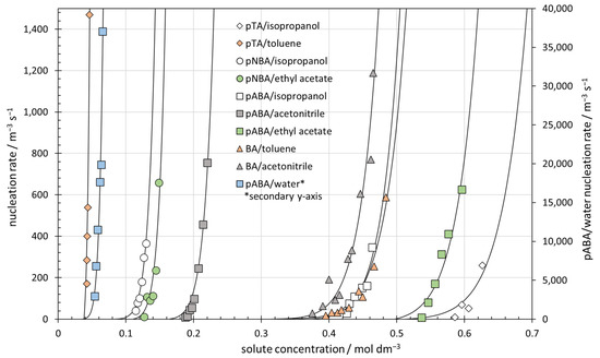 Predicted nucleation rates (full lines), J*, calculated from reported solubilities [56,58,59] with Equation (15) vs. experimental data for para-toluic acid (pTA) in isopropanol and toluene [58], for para-nitrobenzoic acid (pNBA) in ethyl acetate and isopropanol [58], for para-aminobenzoic acid (pABA) in ethyl acetate, acetonitrile, and isopropanol [58], for pABA in water [56,59], and for benzoic acid (BA) in acetonitrile and toluene [58]. The solubilities, rate constants, k*, and minimum rate-contributing aggregate sizes, n*, are given in Table 1. The fits are reported as a function of the absolute solute concentration (rather than the supersaturation ratio, S), because this permits presentation of all data as a single figure; a set of corresponding plots as a function of the supersaturation ratio is provided in the Supporting Information, SI4. Reference [55] provides a discussion of statistical errors associated with the small volume nucleation rate determinations by which the nucleation rate data were measured.