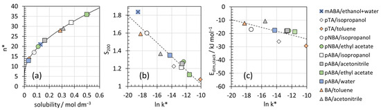 In contrast to n*, the values for the nucleation rate constant, k*, are system-specific, and no significant correlation with the solubility is evident from the values reported in Table 1. However, k* is the dominant factor determining absolute nucleation rates. This is demonstrated easily by examining its relationship with the supersaturation ratio required to achieve a fixed nucleation rate. The supersaturation required for an arbitrarily chosen nucleation rate of 200 m−3 s−1, , has previously [58] been used to compare the systems included in Figure 6. The original motivating idea for choosing a benchmark rate is that its value should increase with the height of the nucleation barrier. Using the influence of the supersaturation ratio on N*, Equation (15), we can now evaluate the relationship between and k*. decreases almost exponentially as a function of k*, resulting in a near-linear dependence of on that is only weakly dependent on the overall solution concentration, (Supplementary Information, SI3). Not surprisingly, therefore, across all benzoic acid systems examined, there is also a significant correlation between and , as shown in Figure 6b. This correlation can be readily understood by invoking the expected Arrhenius behavior of the rate constant, k*, which is associated with an activation energy, EA, and a pre-exponential factor, A, according to