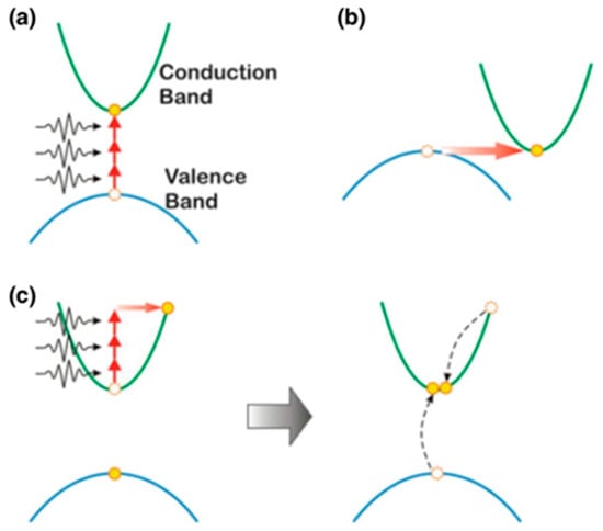 When several photons are absorbed by free electrons, multiphoton ionization results in low–high energy transitions in the conduction band; thus, a free electron gains additional kinetic energy and collides with a valence electron. In this case, energy transfer occurs to produce two free electrons with low energy levels, as shown in Figure 1c. These free electrons absorb photons and collide with valence electrons, initiating an avalanche-like chain reaction; this process is called impact ionization or avalanche ionization [1,7]. Multiphoton ionization and avalanche ionization are highly nonlinear processes [8].