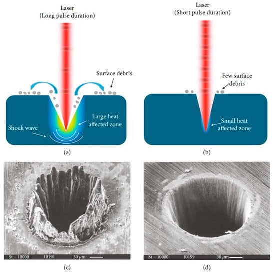 Interaction of a laser with a material for various pulse durations: (a) long and (b) short pulse durations. SEM images of laser-ablated holes fabricated on a 100-µm steel foil using a (c) 780 nm laser (pulse duration: 3.3 ns and energy density: 0.5 J/cm2) and (d) 780 nm laser (pulse duration: 200 fs and energy density: 0.5 J/cm2) [5].