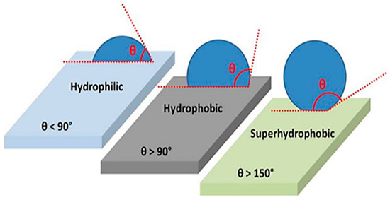 A diagram illustrating the contact angles observed on different surfaces [31].