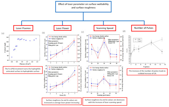 Some laser parameters that affect wettability and surface roughness after surface texturing. (a) CA measurements as a function of laser fluence [29]. (b) Surface roughness Sa and Sz values as a function of average laser power [27]. (c) Surface roughness Sa and Sz values as functions of scanning speed [27]. (d) Water CAs of Ti–6Al–V and AISI 316L stainless steel surfaces as functions of the number of pulses [23].