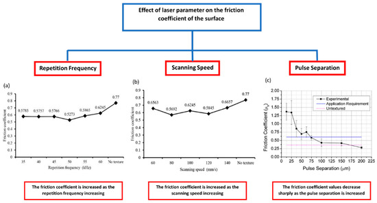 Relation between the coefficient of friction and (a) repetition frequency [37], (b) scanning speed [37], and (c) pulse separation [32].