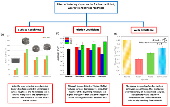Figure 5 illustrates some laser parameters that affect surface wettability and roughness. Figure 6 and Figure 7 illustrate some of the laser parameters that affect the COF of the surface and the effect of laser texturing shape on the COF, wear rate, and surface roughness.