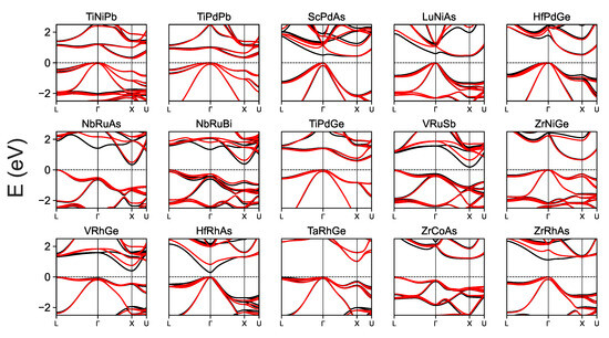 The band structures calculated for the 15 novel hH phases are presented in Figure 1. It is worth recalling that the spin-orbit coupling is a crucial factor for reasonable description of electronic structure of narrow band gap hH systems [34]. Although the effect of SOC is noticeable in valence band splittings of Ru-, Rh-, and Pd-bearing phases in Figure 1, it is relatively weak when compared to those reported for hH antimonides with lanthanide X ions. The materials studied here exhibit semiconducting character with the dominant indirect transition type, except HfRhAs and ZrRhAs with the direct – one (GGA). The band structures of NbRuAs and LuNiAs are similar to those of NbFeSb [12,13] and LuNiBi [36], respectively. ScPdAs and LuNiAs exhibit the specific shape of the conduction bands, with Conduction Band Minumum (CBM) located at the X point (from the MBJ approach for ScPdAs) or in between the X and points (LuNiAs from GGA/MBJGGA and GGA-derived results for ScPdAs). The modifications in Valence Band Maximum (VBM) or CBM locations obtained with different XC functionals are observed in some cases, but not as commonly as the underestimation of with respect to . It is a well-known fact that the modified Becke-Johnson potential is dedicated to studies on semiconductors. Despite that MBJGGA-derived results may be assumed to be more realistic than the GGA ones [23], hH alloys are complex intermetallics and final examinations of theoretical predictions of their electronic structures should be based on further experimental investigations.