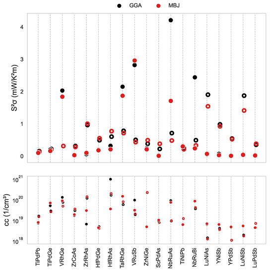 The TE PF at room temperature for the novel hH systems, based on the results of transport calculations, is presented in Figure 2. The majority of hH phases considered here are expected to exhibit PF lower than 2 mW/K2m, regardless of the applied XCF. The highest values of PF are found for the n-type carriers. In particular, the greatest PF of over 4 mW/K2m was obtained (GGA) for NbRuAs. Similarly, VRuSb, TaRhGe, VRhGe, LuNiAs and LuNiSb (in order corresponding to decreasing PF) emerge as promising candidates on TE systems in the n- or p-type regimes. It is worth noting that the optimal carrier concentrations (–) are rather feasible to be obtained in real materials.