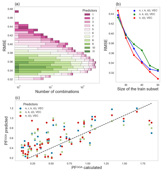 As depicted in Figure 3a, the lowest values of RMSE are achieved for feature sets with limited cardinality. The biggest RMSE values were obtained for single-predictor feature spaces (i.e., i(III)), whereas the optimal RMSE was revealed for more than one dominant combination. Neither the most nor the least numerous combinations of predictors minimize RMSE for the particular model, which justifies the requirement of testing of various combinations of predictors. Analogous observations were reported for SVR models for different physical properties of hH systems [3]. Nevertheless, the general hint on the crucial elemental factors for the target may be the fact that over 150 favourable combinations (from RMSE of 0.319 mW/K2m for [n, r, k, i(I), VEC] and [n, i(I), VEC] to RMSE of 0.339 mW/K2m for [g, k, i(III), VEC]) included at least one of the following predictors: n, i(I), and VEC. The significance of the indicated properties is in accord with the favourable features found in SVR modelling of other parameters of hH phases [3], i.e., i(I) and VEC were crucial for band gaps. Whereas n and i(I) may reflect the width of a band gap and the effective mass, VEC may be connected with some characteristic features of band structures, e.g., the number and shape of valence bands. The predictive power of SVR model based on such a simple combination of three fundamental properties of elements is particularly interesting due to the fact that TE performance is a complex phenomenon.