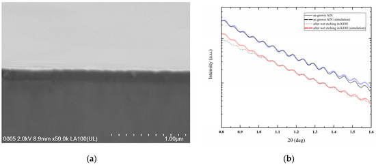 (a) FESEM cross-sectional images of AlN with 70 cycle numbers, (b) XRR and its simulated curves for 70 cycle PMOCVD AlN before and after KOH wet etching.