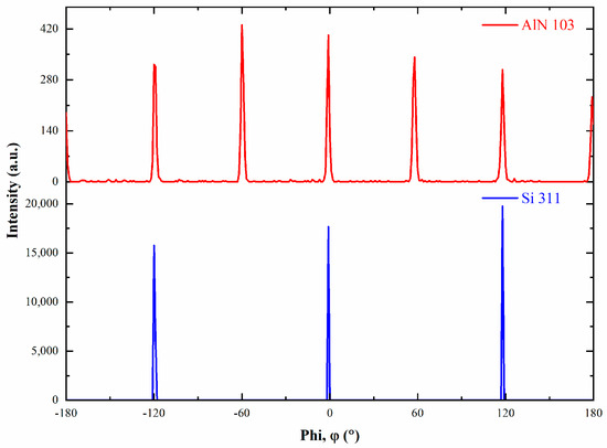 Thereafter, the crystalline properties of the as-grown AlN epilayers were analysed by HR-XRD using a Cu Kα1 X-ray source with wavelength, λ, of 1.5406 Å. The sample with 70 PMOCVD cycle number 70 was exclusively subjected to a phi, φ scan. Figure 5 shows the φ scan of the AlN 10–13, which reveals the sixfold rotational symmetry separated by 60°, indicating that the film is a single crystalline hexagonal AlN [29]. For Si 311, the φ scan shows the three-fold rotational diffraction peaks with intervals of 120°. This observation confirms the in-plane relationship of the epitaxial growth between AlN [1100] and Si [112] [30,31]. In addition, researchers commonly employed a ω-scan, also known as X-ray rocking curve (XRC) measurement, to investigate the crystalline quality of epitaxial films. The full width at half maximum (FWHM) of the XRC measurements are often used to characterize the structural perfection and degree of crystallinity. At higher degrees of crystalline perfection, a perfectly aligned lattice structure will result in more coherent diffracted X-ray from the crystalline lattice structure, which concurrently reduces the FWHM width [32]. Conversely, wider FWHM suggests a greater degree of imperfection. The imperfection in crystal structure may have originated from lattice defects, threading dislocations, and grain boundaries. These imperfections disrupt the regular arrangement of the lattice structure, leading to the scattering of diffracted X-ray over an angle.