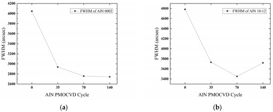 Figure 6a shows the FWHM of AlN 0002, a remarkable decrease in FWHM value is observed as the cycle number increases from 0 to 70 cycles, from 4046 arcsec to 2756 arcsec. Nevertheless, when the cycle number increases to 140, the decreasing trend becomes almost saturated. A similar trend is observed for AlN 10–12 for the cycle numbers from 0 to 70 as the FWHM value dramatically reduces from 4783 arcsec to 3450 arcsec. However, a further increase to 140 cycle number monotonous increase to 3720 arcsec (see Figure 6b). These observations suggest that the AlN epilayers’ crystalline quality are significantly improved due to the introduction of the PMOCVD technique in the epitaxial structure. The FWHM results of AlN 0002 are comparable with the other AlN growth reports using various techniques as listed in Table 1 [15,25]. The narrowest FWHM observed at 70 cycle indicates that the crystalline quality of the as-grown AlN epilayer have a higher degree of crystalline imperfection with a well-defined lattice structure. The broadening of FWHM with a prolonged PMOCVD cycle from 70 to 140 may have resulted from the increase in the surface roughness as observed in the AFM measurement. During the coalescence of the AlN grain island, the growth of the larger grain island may surpass the smaller one and will induce threading dislocations in the epitaxial layer [33]. The Al–N bond in the c-direction of the hexagonal AlN crystal structure is stronger than the three in-plane bonds, increasing the likelihood of rotation in the mosaic structure and ultimately, increasing the diffracted X-ray scattering and XRC peak widening.