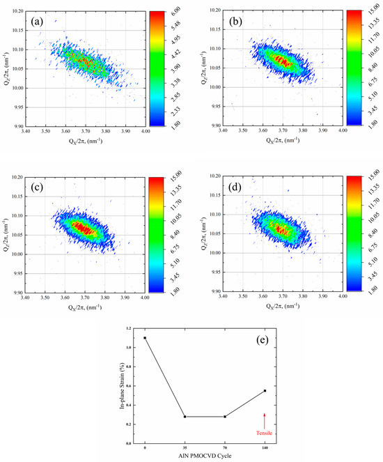 XRD reciprocal space mapping (RSM) of AlN 10–15 for the AlN epilayers grown on the Si (111) substrate with (a) 0, (b) 35, (c) 70, and (d) 140 PMOCVD cycle number. (e) The in-plane strain of the AlN epilayers as a function of PMOCVD cycle number.