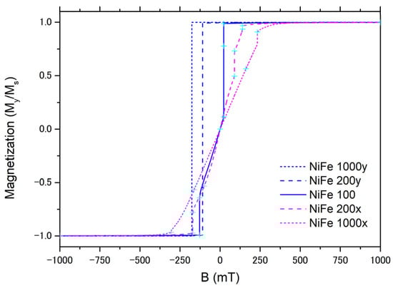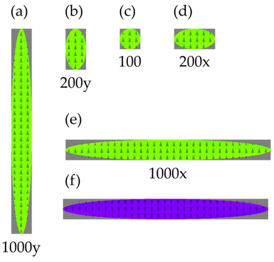 The software Mumax3.10 [43,44,45] used in the present study allows one to determine the magnetisation within a particle of predescribed shape with a resolution defined by the size of the voxel. The voxel size in this study is , corresponding to the modelled materials. The nanoparticles considered here are 30 nm thick and show an elliptical in-plane shape. Thus, they are elliptical flat cylinders. The ratios of the semiaxes of the ellipses encompass values 1 (circle), 2 and 10, the short semiaxis being constantly held at 100 nm. The present selection of sizes relies on the existing examples of thin magnetic particles [46]. The considered shapes are shown in Figure 1. In what follows, the particular shapes will be labelled by the material NiFe for permalloy and Co for cobalt. In the latter case, the orientation of the easy axis x or y will be indicated by Ax or Ay, respectively. The semiaxis ratio of each shape will be specified by giving the length of the longer semiaxis. Consequently, the permalloy particle with the semiaxes 100 nm in the x direction and 200 nm in the y direction will be denoted by NiFe200y, whereas when the longer axis is 1000 nm in the x direction the symbol will be NiFe1000x. Correspondingly, we will have CoAx200y as the label for the easy axis of cobalt in the x direction and the ellipse’s long semiaxis of 200 nm in the y direction.