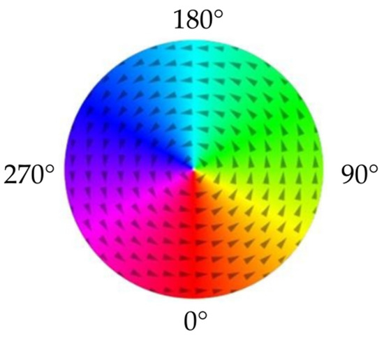 Colour wheel illustrating orientations of magnetisation in the pixels of the shapes studied here. The direction of arrows is correlated with colours; green: vertical upwards, violet: vertical downwards, red: horizontal right, cyan: horizontal left.