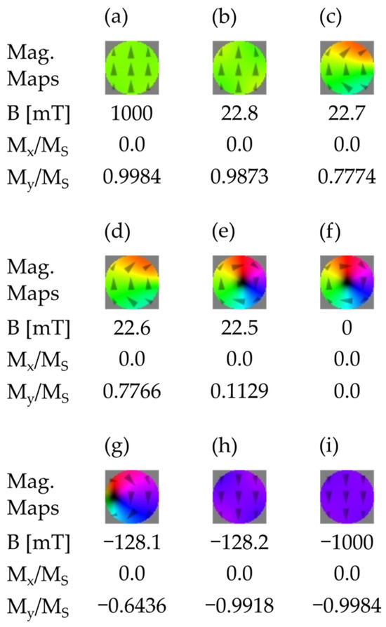 An S-shaped deviation from homogeneity is sometimes also an initial stage of a vortex, i.e., a structure where the magnetisation vector revolves around a point or, better to say, around a short axis of the system parallel to the z direction perpendicular to the image plane. An example is visible in Figure 4 for a circular shape. In this case, the initial S-shaped configuration () transforms into a C-shaped one ( and ) and further rolls up to the fully developed vortex at and , which at starts to be moved away, giving room to a reversed parallel configuration with transitorily a trace of an S-shaped deviation