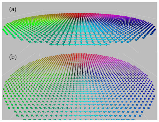 The vortex configuration is in fact not entirely flat. A vertical component (z direction) grows progressively when approaching the core of the vortex, as is shown in Figure 5. Due to the symmetry of the problem, the orientation of the vortex and, consequently, the direction of the core sticking out of the plane is equiprobable up and down ( and ).
