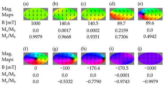 Magnetisation maps for the horizontally elongated particle NiFe200x recorded at the field intensities marked with cyan crosses along the dashed magenta line in Figure 3. (a) saturated FM configuration, (b–e) development of vortex from C -shaped deviation, (f) fully developed vortex (g–j) gradual removal of vortex till saturated rFM configuration.