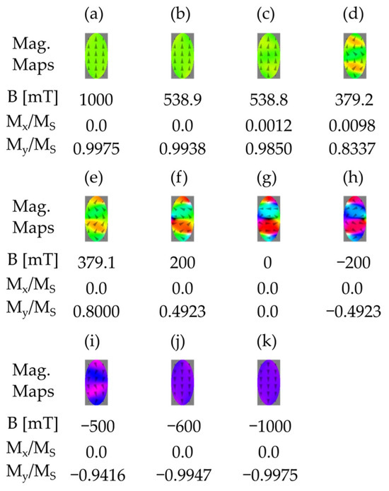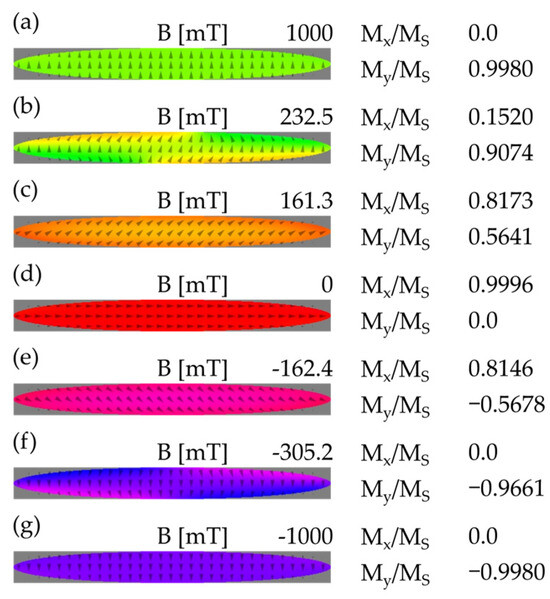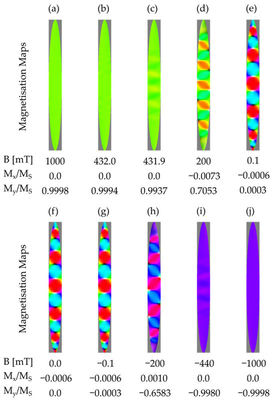 Magnetisation maps for the case when the long axis of the particle is directed perpendicular to the magnetic field are shown in Figure 6. Here, again, an initially S-shaped deviation evolves to a C-shaped one, and further, towards a vortex, which seems to enter the shape from the left (Figure 6e). The shape anisotropy is too weak here, so that the system does not take on the equilibrium zero-field single-macrospin configuration with the magnetisation along the long axis. The latter occurs for a ratio of the semiaxes equal to 10; see Figure 7.