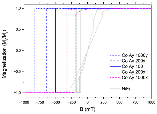Consequently, the most pronounced feature of the switching in the cobalt nanoparticles with the particle’s long axis parallel to the magnetocrystalline easy axis is that the coercive fields are markedly stronger (Figure 8). This results from a synergy of the magnetocrystalline and shape anisotropy enhancing the magnetisation alignment along the y axis. The hystereses are more squared even for the long axis in the x direction. The only remarkable feature is a rounding in the upper part of the switching curves CoAy200 and CoAy1000. The roundings of the reversal curves visible in Figure 8 can be attributed to clear S-shaped deformation, similar to those in Figure 7b, visible in the corresponding magnetisation maps (not shown). Otherwise, the switching is one-stage in the adopted approximations. The ensemble of phenomena described above reflects magnetocrystalline anisotropy prevailing over the shape anisotropy.