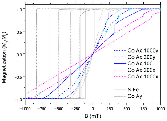 Magnetisation reversal curves for cobalt nanoparticles with easy axis in x direction from top right: saturation upwards (+y) to left bottom: saturation downwards (−y). The notation for the shapes given in the right bottom indicates the size of the particle. Solid line corresponds to the circular shape. Navy blue lines concern shapes elongated in y direction and the magenta lines those elongated in x direction. The cyan crosses show locations of the magnetisation maps represented in Figure 10, Figure 11 and Figure 12. The crosses belonging to each line correspond to the respective shapes. The grey lines in the background are the same as in Figure 2, Figure 3 and Figure 8.