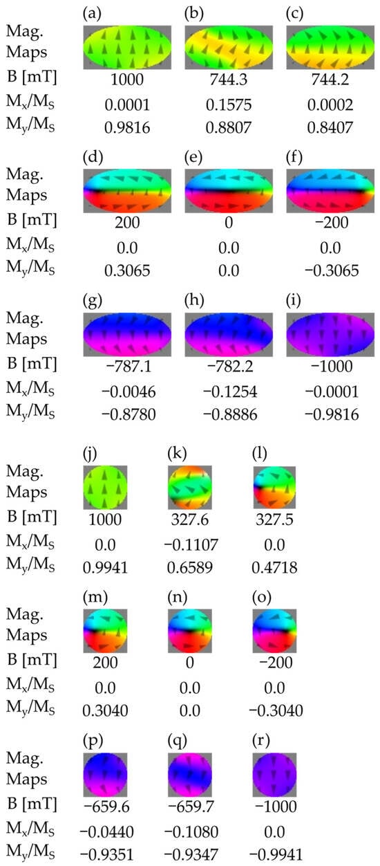 Remagnetisation of the shorter system CoAx200x, see Figure 10, starts with an S-shaped deviation evolving to a flattened vortex (Figure 10d–f), which can be assimilated to two domains with a horizontal domain wall. With a reversed field, there is apparently no symmetry: Figure 10g–i show rather an evolution of a reversed C-shape to an S-shape. In a regular circle (Figure 10j through Figure 10r), the sequence is fairly similar.