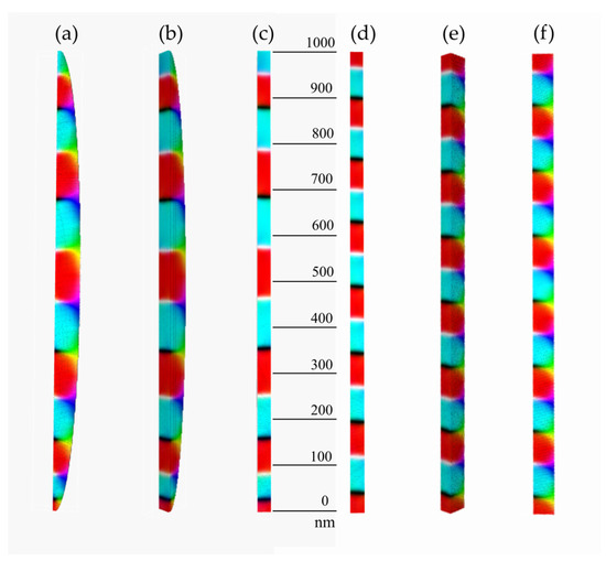 The size of the domains in Figure 12f and Figure 13, measured as the distance between neighbouring black–white or white–white fairly sharp boundaries, varies with the particle’s width. Looking at the scale in Figure 13a–c, one sees that the domain size in the direction of the long axis grows from about 50 nm close to ends of the particle to almost 100 nm in the central part. This indicates a possibility of designing devices with a tuneable variable periodicity controlled by the width of the shape (see e.g., ref. [15]). The observation is corroborated by the calculus for a cuboid circumscribed on the elliptical cylinder, where the domain boundaries are close to equidistant.