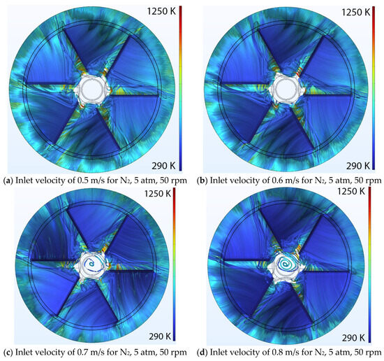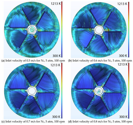 This section focuses on the influence of changes in inlet velocity magnitude and rotational speed on the flow streamlines within chambers at 5 atm (presented in Figure 1, Figure 2 and Figure 3, depicting a top view of the reactor). These figures illustrate the circulation of nitrogen in the numerical domain for three different rotational speeds (rpm) at 5 atm. Figure 1 displays the nitrogen circulation for a fixed rotational speed of 50 rpm (rotational speed of the carrier disk) and four different inlet velocity magnitudes: 0.5, 0.6, 0.7, and 0.8 m/s. It is important to note that the velocity streamlines in this figure (and all other similar figures of this article) are color-coded based on temperature, with the legend bar indicating higher temperatures in the red range and lower temperatures in the blue range.