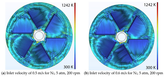 Based on the data presented in Table 3, it is evident that an inlet velocity of either 0.7 m/s or 0.8 m/s is required at all rotational speeds to achieve a smooth flow on the surface of the wafers and meet the defined pass/fail criterion for an operating pressure of 5 atm. Given that lower flow rates and rotational speeds are preferable, it can be inferred that nitrogen at 5 atm would necessitate an inlet velocity of 0.7 m/s for optimal performance within the chambers.