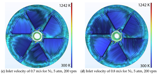 Figure 2 and Figure 3 present comparable data sets for nitrogen at the operating pressure of 5 atm, with rotational speeds of 100 rpm and 200 rpm, respectively. Similarly in Figure 1, the observation drawn from the data is that as the inlet velocity increases, the streamlines appear noticeably more streamlined.