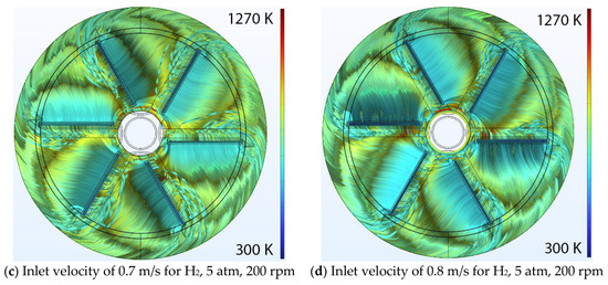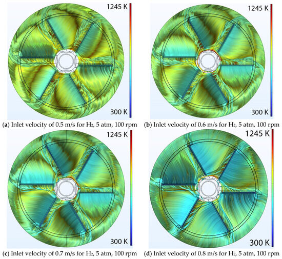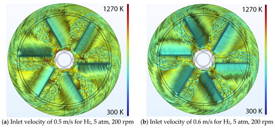 The numerical results of various operating pressures inside the numerical domain using hydrogen as the working fluid are presented in this section. Figure 4, Figure 5 and Figure 6 present comparable information as in Figure 1, Figure 2 and Figure 3 but for hydrogen as the working fluid. The defaulting number of 10,000 velocity streamlines, temperature color-coded, was implemented to depict the flow patterns in the numerical chambers. As can be understood, the chaotic gas flow movements in the chamber became weak as the inlet gas speed increased from 0.5 to 0.8 m/s. By applying the identical passing/failing criterion, the results for hydrogen at 5 atm and various rotational speeds are condensed and presented in Table 4. Visual representations of the progression of flow patterns figures for hydrogen at higher pressures are made available in the supplementary document (Section S2 and Figures S10–S18), and the pass/fail criteria are provided in Table 4.
