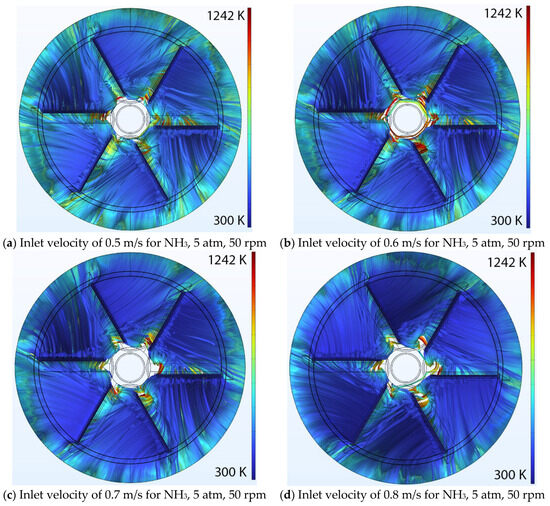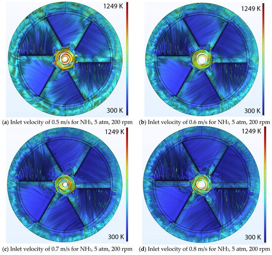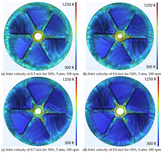 Ammonia, chosen as the third working fluid, was utilized to explore the flow and thermal patterns within the computational domain. Like in Section 5.1 and Section 5.2, the authors examined various flow patterns at different inlet velocities and rotational speeds to identify the most favorable conditions for achieving smooth flow patterns over the wafer. Contrary to nitrogen and hydrogen, for which the data were sourced from the internal COMSOL library for the properties, the properties of ammonia were taken from the National Institute of Standards and Technology (NIST) webpage and from [42] to allow for an assessment of this system at higher pressures. Ammonia was only investigated up to a pressure of 10 atm, as it is anticipated that it would condense in the system and supply lines feeding the system above these values due to its liquid/gas transition pressure of 10.5 atm at 300 K.