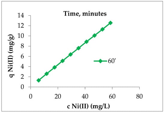 According to the literature, it is recommended that the contact time between phases be extended to capture crucial information about interfacial dynamics and the equilibrium [15]. The experimental data demonstrate that an increase in the contact time between the Sarkanda grass lignin and aqueous nickel solution results in a greater amount of the retained methyl–alkyl ion. This effect is more pronounced in the initial stage, after which the process slows down. The maximum amount is reached at 60 min, which can be considered the optimal time for achieving equilibrium (Figure 3). The 90 min contact time was excluded as there were no significant differences in adsorption capacity compared to the values recorded at 60 min.