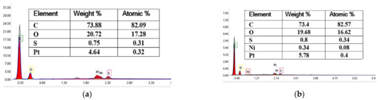 For the SEM analysis, the prepared sample has been metallized with Pt to improve the contrast, thus resulting in Pt in both samples. The SEM micrograph of the uncontaminated lignin clearly shows a well-separated particle agglomeration of approximately a 4 μm length (Figure 9a). The micrometric dimensions of these particles that form aggregates were also confirmed by the diffraction analyzer. It can be seen that the surface morphology of the unmodified lignin was different from the one observed for lignin contaminated with Ni(II), a fact that confirms the contact between the two phases, the diffusion of the polluting species, and its adsorption in the pores of the lignin polymer (Figure 9b).