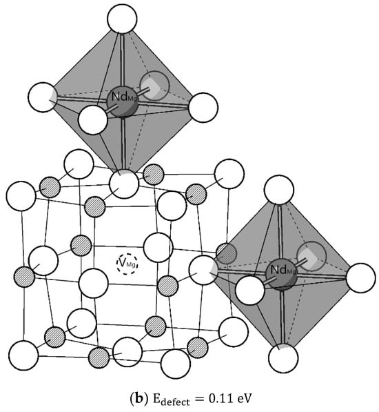 From the perspective of optical applications, the main purpose of doping active ions into a host material is, on the one hand, to take advantage of the unique physical properties of the host, such as thermal conductivity and intrinsic transparency; on the other hand, it is to take advantage of the crystal field of the host. The coordination environment (such as coordination number and coordination polyhedron) plays a significant role in doped optical materials as it had been observed and studied in crystal field theory [54]. When it comes to optical centres of rare earth ions, it is known that their electronic structures are less perturbed by the structure of the host material. The 4f orbitals are often unfilled, and they are well sheltered by the outer 5s5p orbitals according to the Aufbau principle. However, the optical properties of the doped system, or the absorption and emission of dopants are still impacted by the local atomic structure. The nature of doping means that the induced distortions in the host should not be ignored: that is, it is necessary to focus on the point defect configurations. In this section, point defects and defect complexes induced by Nd are investigated, and coordination distortions are revealed. By introducing Nd, two possible types of point defects are present, and , and their defect formation energies were calculated to be −19.53 eV and −11.37 eV, respectively. These are the two forms in which Nd can be incorporated into MgO.