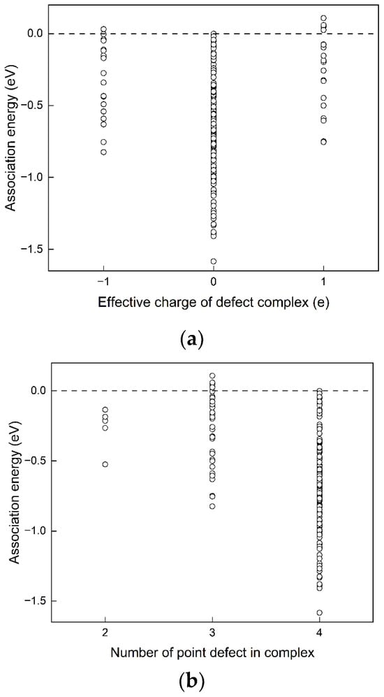 Association energies of defect complex containing and : (a) Eassociation vs. EC; (b) Eassociation vs. N.