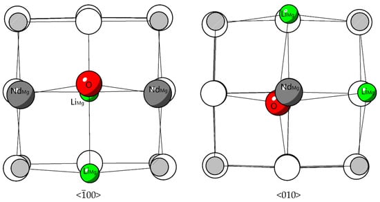 According to the experimental results obtained by Dorel [12], ionic exchange between Nd and Mg was not observed when MgO was the host. So, Nd dopants may not be successfully doped into the MgO host, or the quantity doped may have been too low to remain detectable. The difficulty of doping rare earth elements into MgO was also stressed by Sannamyan [13]. Li co-doping has been experimentally proven to improve the crystallinity and optical performance in rare-earth-doped MgO [6,9,10]. It is important to ask the following questions: In which way is Li making an impact? Does Li make it easier for Nd to enter the MgO host? The standing points to view the questions here are structure and energy. A similar procedure as in Nd:MgO was conducted: defect and association energies were calculated for Nd, Li:MgO. Via Li co-doping, two extra possible point defects are introduced— and —and the defect energies were calculated to be −1.23 eV and 15.89 eV, respectively. The quasi-chemical reactions for these two-point defects in Li:MgO are as follows: