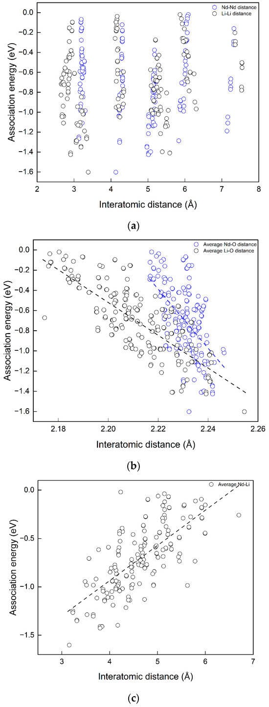 Correlations between interatomic distance and association energy: (a) Nd–Nd and Li–Li distance; (b) average Nd–O and Li–O distance; (c) average Nd–Li distance.