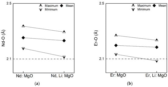 Comparisons of RE–O bond lengths in RE:MgO and RE, Li:MgO. RE = Nd or Er. Grey line: trend line: (a) Nd:MgO and Nd, Li:MgO; (b) Er:MgO and Er, Li:MgO.