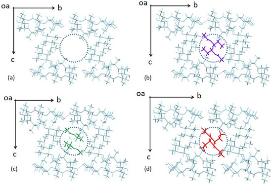 Molecular arrangements of Form 0′ and three solvates. (a) Form 0′, (b) CLA-PAC solvate, (c) CLA-IPA solvate, (d) CLA-EB solvate, where the blue dashed circles represent the channel structure; CLA, PAC, IPA, and EB molecules are colored in light blue, purple, green, and red, respectively.