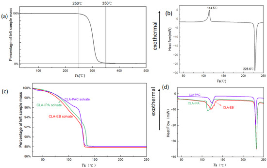 The TGA and DSC profiles of the three crystals prepared in Experiment 2.2 via method (1) are shown in Figure 3c,d. All TGA profiles presented significant weight losses, which corresponded to wide endothermic peaks in the DSC profiles in the same temperature ranges (109.3 °C~134.9 °C, 109.7 °C~130.8 °C, and 99.3 °C~133.8 °C, respectively, for the three solvates), indicating solvent removal. The weight losses of the three samples were 11.88%, 12.10%, and 12.15%, respectively, which basically matched the solvent stoichiometries determined by SCXRD (12.01%, 12.01%, and 13.44%, respectively), indicating that the obtained crystals were the CLA-PAC solvate, CLA-IPA solvate, and CLA-EB solvate. The weight loss of the sample of CLA-EB solvate was slightly lower than the crystallographic data, which was due to the escape of the solvent molecules during the test. The CLA-IPA solvate has been published by Liang’s work [12]; here, we determined its crystal structure. At the same time, the solvates of CLA-PAC and CLA-EB obtained in this work were reported for the first time. This second endothermic peaks in the DSC curves of the three solvates appeared at approximate temperatures of 230.3 °C, 231.7 °C, and 231.7 °C, respectively. There were no weight losses at these temperature ranges in the TGA curves, thus we speculate that the endothermic peaks on the DSC curves should belong to the melting process of Form II.