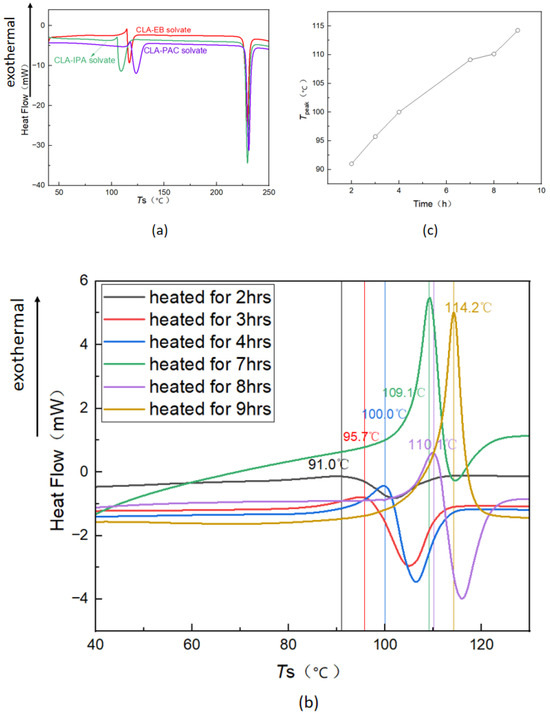 (a) DSC of the mixture obtained after the solvate was processed by method (2). (b) DSC of heating the CLA-PAC solvate processed by method (1) for different hours. (c) Temperature of the exothermic peak changing with the heating duration.
