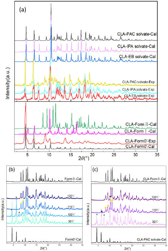 (a) Experimental and calculated PXRD patterns of the solvates and Form 0′. (b) VT-PXRD patterns of CLA Form 0′ (In (b), the red circle represents the disappeared peaks, while the yellow triangle marks represent the peaks belong to the formed crystal). (c) VT-PXRD patterns of the CLA-PAC solvate (In (c), the yellow triangle marks represent the peaks belong to the formed crystal, while the green and the black circle marks represent the disappeared peaks).