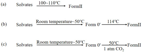 Three pathways of transforming the solvates to Form II (For pathway a: the solvates are directly transformed to Form II by heated in 100~110 °C; for pathway b: the solvates have the chance to desolvate at room temperature~50 °C, forming Form 0′. And then by being heated in 114 °C, Form 0′ transform to Form II; for pathway c: the solvates have the chance to desolvate at room temperature~50 °C, forming Form 0′. With Form 0′ being heated in 50 °C under 1 atm CO2, Form II is formed).