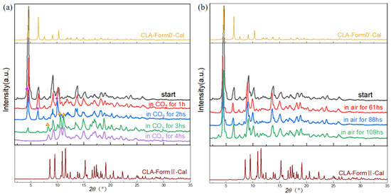 Next, the effect of the 1 atm CO2 atmosphere on the polymorphic transformation of Form 0′ to Form II was investigated using crystalline phase monitoring by PXRD. The PXRDs of the samples at 1 h, 2 h, 3 h, and 4 h are shown in Figure 7a. After 3 h (green curve), the intensities of the characteristic peaks of Form 0′ at 2θ = 4.601°, 6.492°, and 10.106° decreased (marked as purple circle). At the same time, the characteristic peaks of Form II appeared at 2θ = 8.445°, 10.748°, and 11.356° (yellow triangle marks). At 4 h, the PXRD was in agreement with that of Form II, indicating that Form 0′ completely transforms into Form II at this time. The results of the comparative experiments in the air atmosphere at the same temperature and pressure are shown in Figure 7b. The PXRD pattern at 61 h indicates that the polymorph was Form 0′ at this time. At 88 h, the characteristic peaks of Form 0′ (2θ = 4.601°, 6.492°, and 10.106°) were still present, although their intensities became weak. Up to 108 h, no characteristic peaks of Form II were observed. The results show that CO2 can significantly promote the polymorphic transformation of CLA Form 0′ to Form II. Based on the above results, a new pathway was designed for the preparation of Form II with the CLA solvates, as shown in Figure 6c: the solvate (either the CLA-PAC solvate, the CLA-IPA solvate. or the CLA-EB solvate) desolvates to form Form 0′ in the temperature range of room temperature to ~50 °C, and then Form 0′ transforms into Form II in a 1 atm CO2 atmosphere at 50 °C. The crystals obtained by this method were characterized by DSC and PXRD. As shown in Figure S12, there was only one endothermic peak at 229.3 °C in the DSC curve, and the PXRD pattern was consistent with that of Form II with no characteristic peaks of Form 0′, indicating that the crystals prepared by the new method were pure Form II.