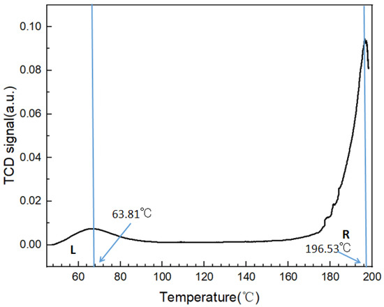 The results of TPD measurement are shown in Figure 8. The results showed that two signals appeared at 63.81 °C and 196.53 °C, respectively, during the desorption process at higher temperature, indicating that there were two types of chemisorption sites (labeled L and R, respectively, in Figure 8). The desorption amounts of CO2 at peaks L and R were 0.04813 mmol·g−1 and 0.9487 mmol·g−1, respectively. The low desorption amount corresponded to the chemical adsorption of CO2 by the groups with weak electronegativity, while the high desorption amount corresponded to the chemical adsorption of CO2 by the groups with strong electronegativity. Considering the incomplete peak R caused by the sample melting when heated to 200 °C, the total capacity of chemisorption should be greater than 0.9968 mmol·g−1. Obviously, the capacity of the chemical adsorption is significantly greater than that of the physical adsorption. Therefore, the chemisorption of CO2 plays a major role in promoting the polymorphic transformation.