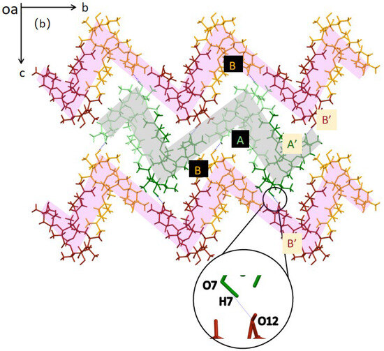 Comparing the non-solvated form with the CLA-Eth solvate (deposited at the CCDC, deposition number 700729, Table S1 [15]), it can be seen that the crystal system and space group of the two forms were the same, and the CLA molecular conformation (see Figure S2 cyan and orange) and molecular packing pattern (see Figure 2a and Figure S3) of the two forms were similar. Form 0′ has been reported as a desolvated isostructural form of the CLA-Eth solvate by Tian et al. [12]. Therefore, it is reasonable to infer that the non-solvated form crystallized in DMC was Form 0′. In addition, the molecular conformations of CLA in Form 0′ and Form II (deposited at the CCDC, deposition number 780856 [12], colored in red in Figure 2) were basically identical, suggesting that the two forms are packing polymorphs.