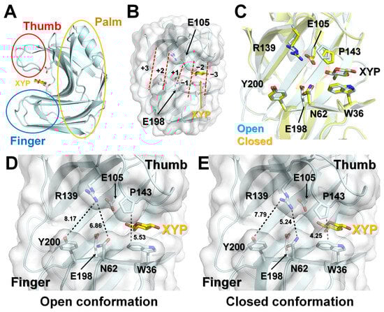 In the superimposed open conformations of the TsaGH11-XYP and TsaGH11-Apo structures, a substantial shift in the position of the thumb domain was observed (Figure 3A). Specifically, the thumb domain of TsaGH11-XYP moved closer to the −2 subsite of the substrate-binding cleft compared to that of TsaGH11-Apo. In the open conformation of TsaGH11-XYP, the main chains of the Pro143 and Ile145 residues on the thumb domain shifted toward the −2 subsite of the substrate-binding cleft by approximately 0.61 Å and 0.66 Å, respectively, compared to that of TsaGH11-Apo. These results suggest that the XYP molecule induces a positional shift of the thumb domain toward the XYP binding site, which indicates that the thumb domain also contributes to stabilizing the XYP molecule.